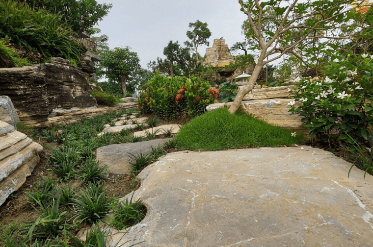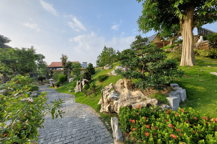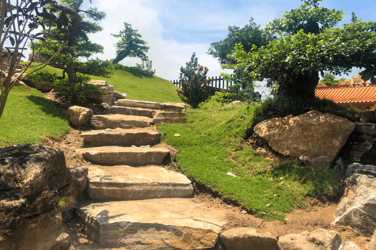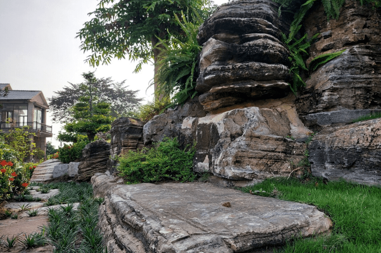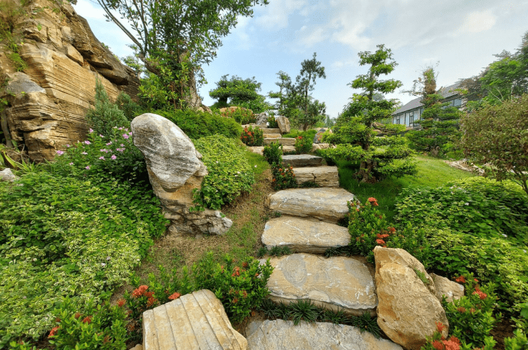Đan xen với những cây cỏ thì đá là một phần không thể thiếu. Bậc thang đá tạo nên những lối đi huyền ảo, tác động qua lại lẫn nhau. Giúp không gian thêm phần sinh động, bắt mắt.