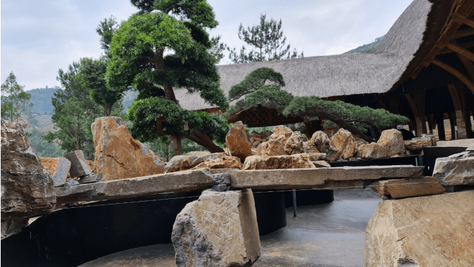 Nay Saigon Stone được đặt chân đến và thi công tại đây. Sử dụng các hòn đá, cây cảnh, sắp xếp cẩn thận góp phần làm du khách cảm nhận được không gian núi rừng có sương mây giăng quyện cùng mùi cơm lam nếp Tú Lệ. Thư giãn lạ thường!