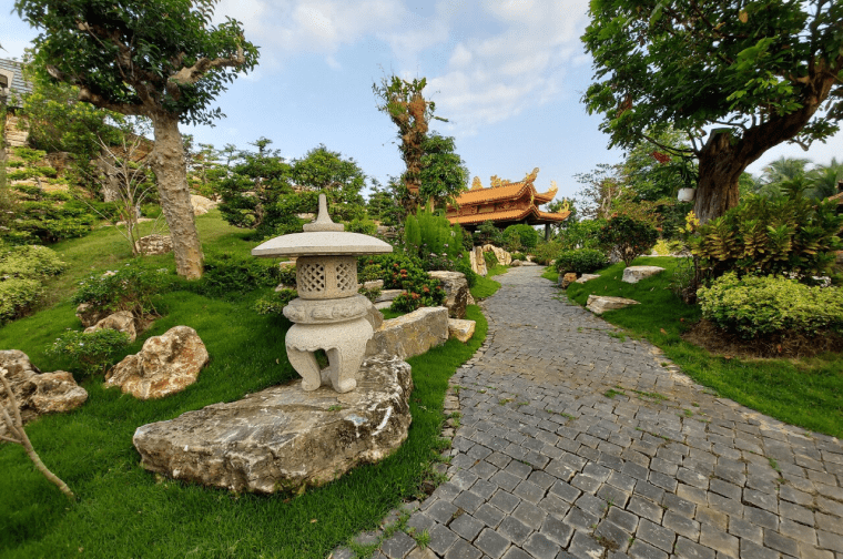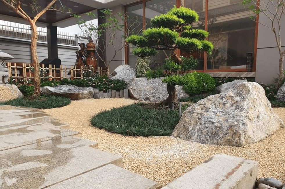 Trong thiết kế sân vườn Nhật thường được đặt những chiếc đèn đá tại một số vị trí trong khu vườn. Bạn cũng có thể đặt một vài tượng đá xung quanh sân vườn để tạo sự chú ý.